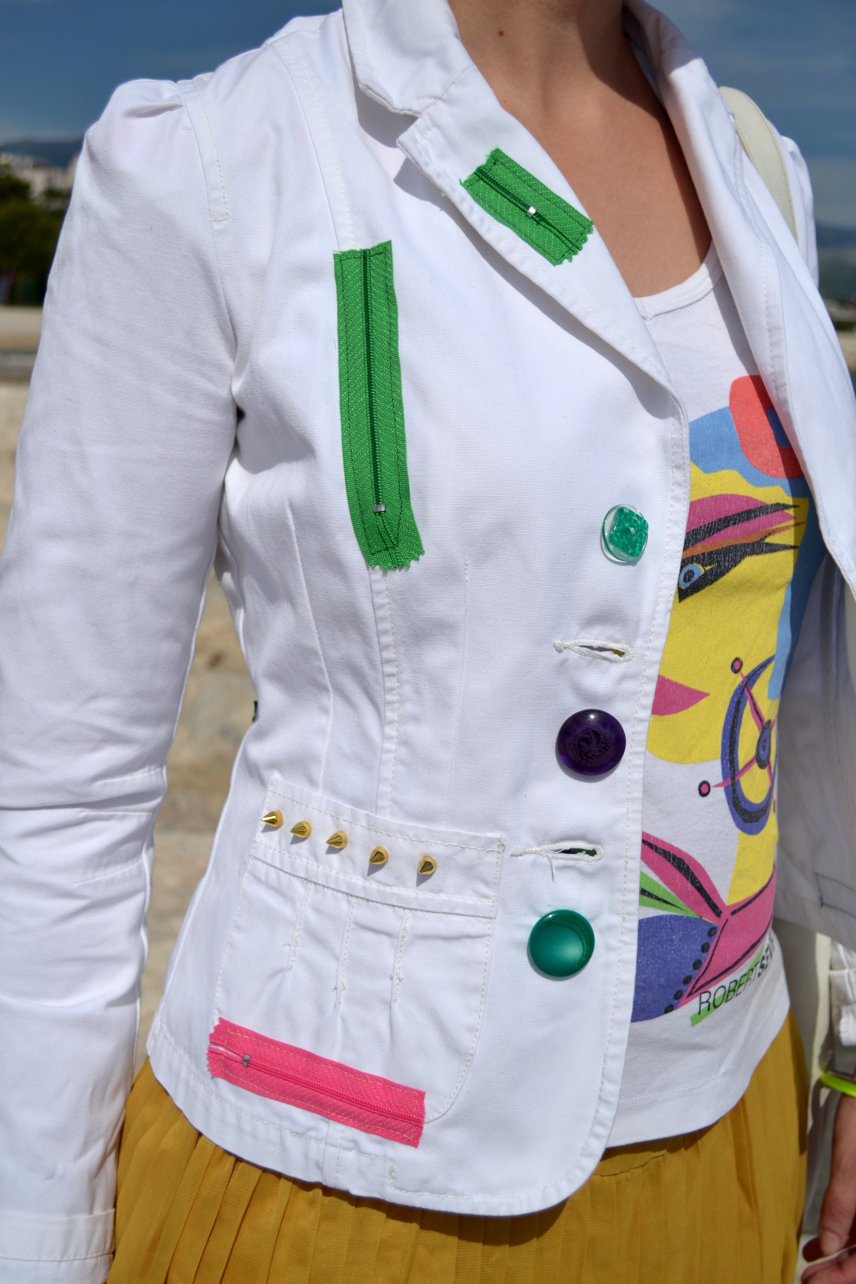 This jacket was bought at “Mango” store. It was an ordinary white jacket so I was quickly bored by it – with some comic prints, colorful buttons and zippers I added it my own colorful touch 🙂