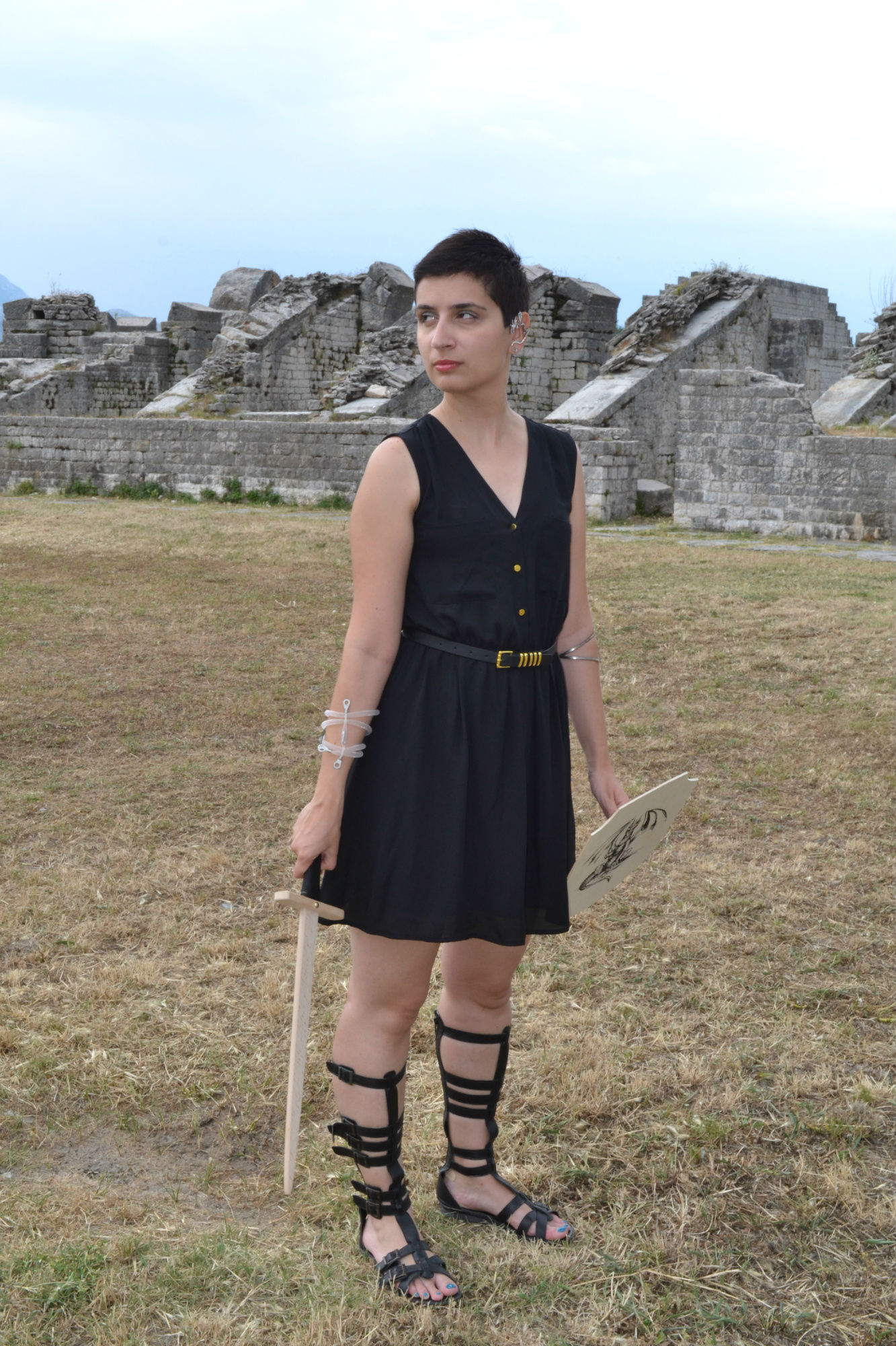 Black chiffon dress and fake leather belt by H&M, black leather gladiator shoes by “Bata”