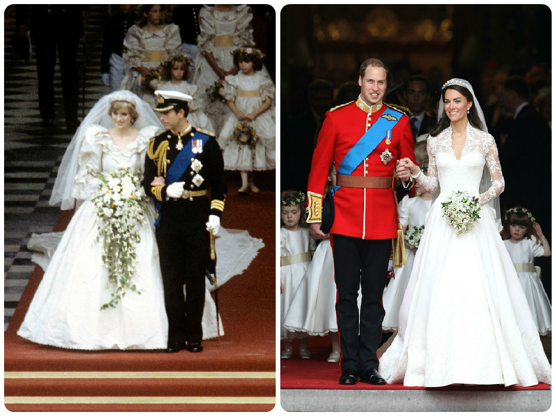On the left wedding dress worn by Queen Victoria, on the right Queen Elizabeth II on her wedding day