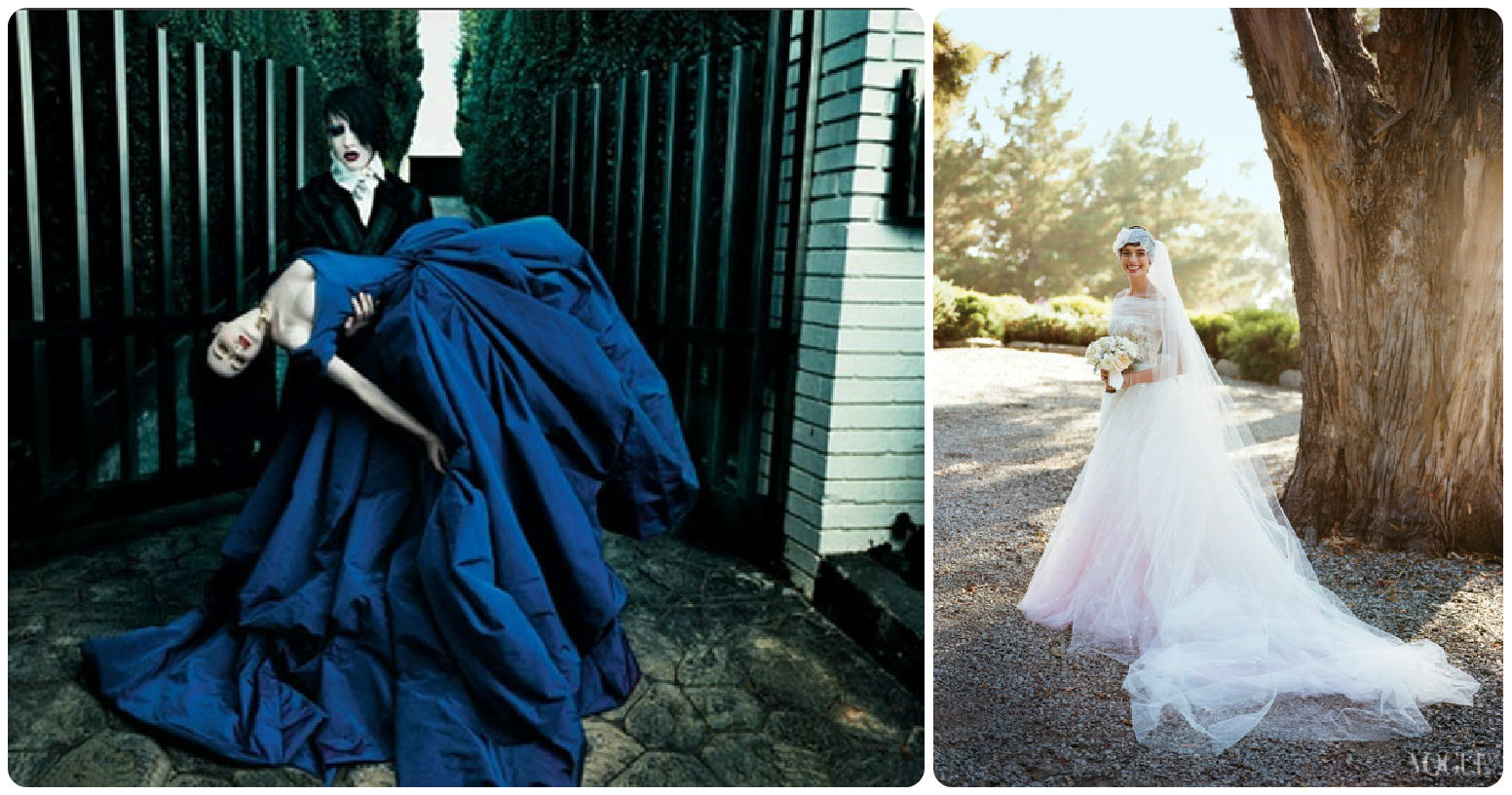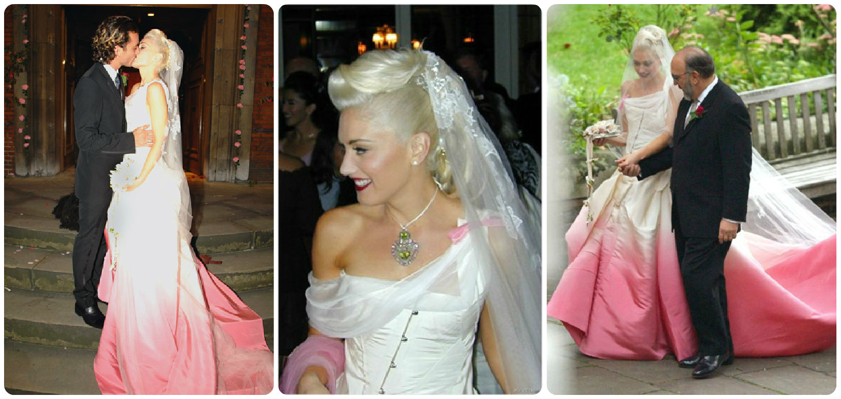 One of my all time favorite wedding dresses is this stunning dress worn by Gwen Stefani – she stuck to her rock’n’roll roots for her wedding.The hem of her custom-made Christian Dior gown, designed by John Galliano, was hand painted in a striking magenta color, creating an ombre effect. The dress is very romantic and slightly shocking: it has been designed to make it appear as if the groom has already tried to start undressing the bride leaving her dress in disarray !!