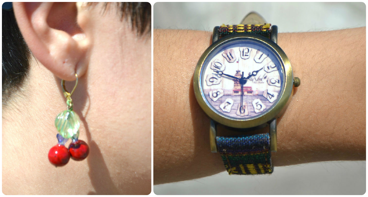 Handmade cherry earrings bought at Etsy, watch with motif of “Prince Tower” bought in Istanbul