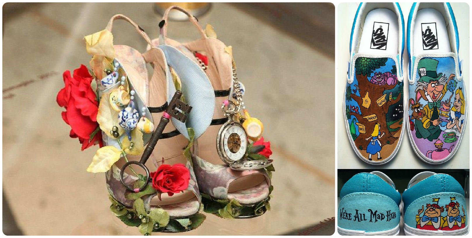 L: Alice inspired heels by Christian Louboutin; R: handpainted Alice sneakers found on Etsy