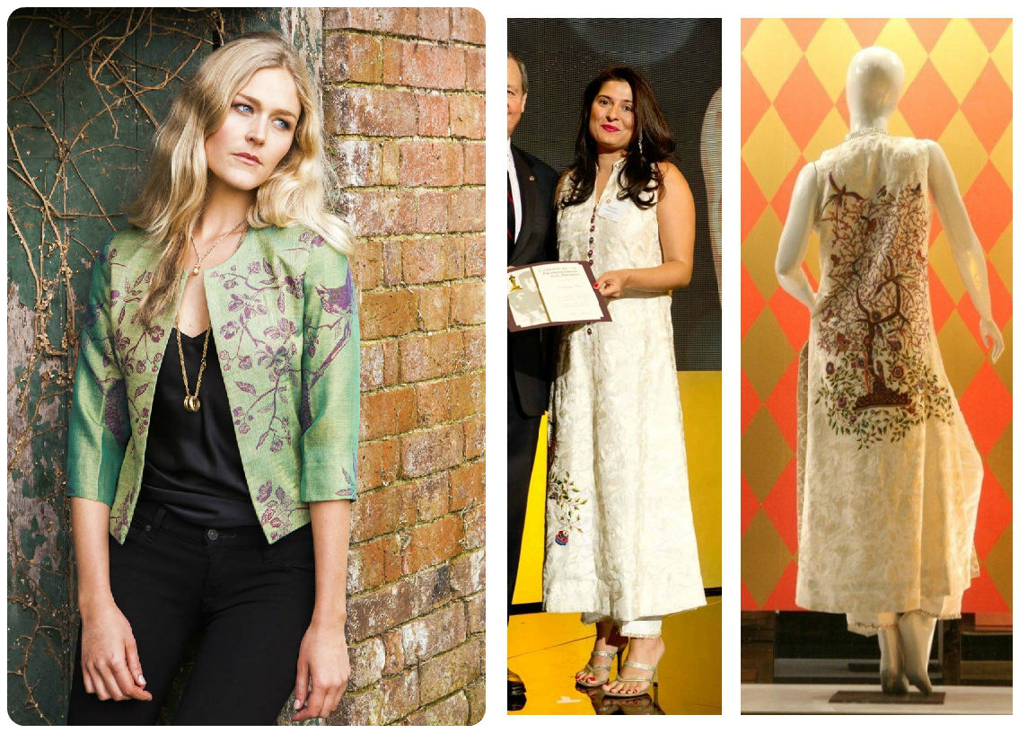L: Cashmere and silk jacket by Shibumi Style, R: dress by Sania Maskatiya, worn by Sharmeen Obaid Chinoy while winning Academy Award for her documentary, Saving Face in 2012.