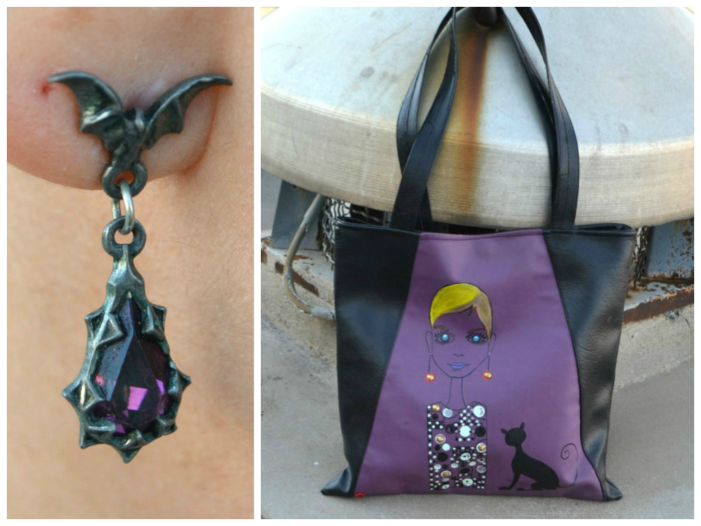 “Morticia” bat earring by Alchemy Gothic; hand painted leather bag by “Poppy Bags”