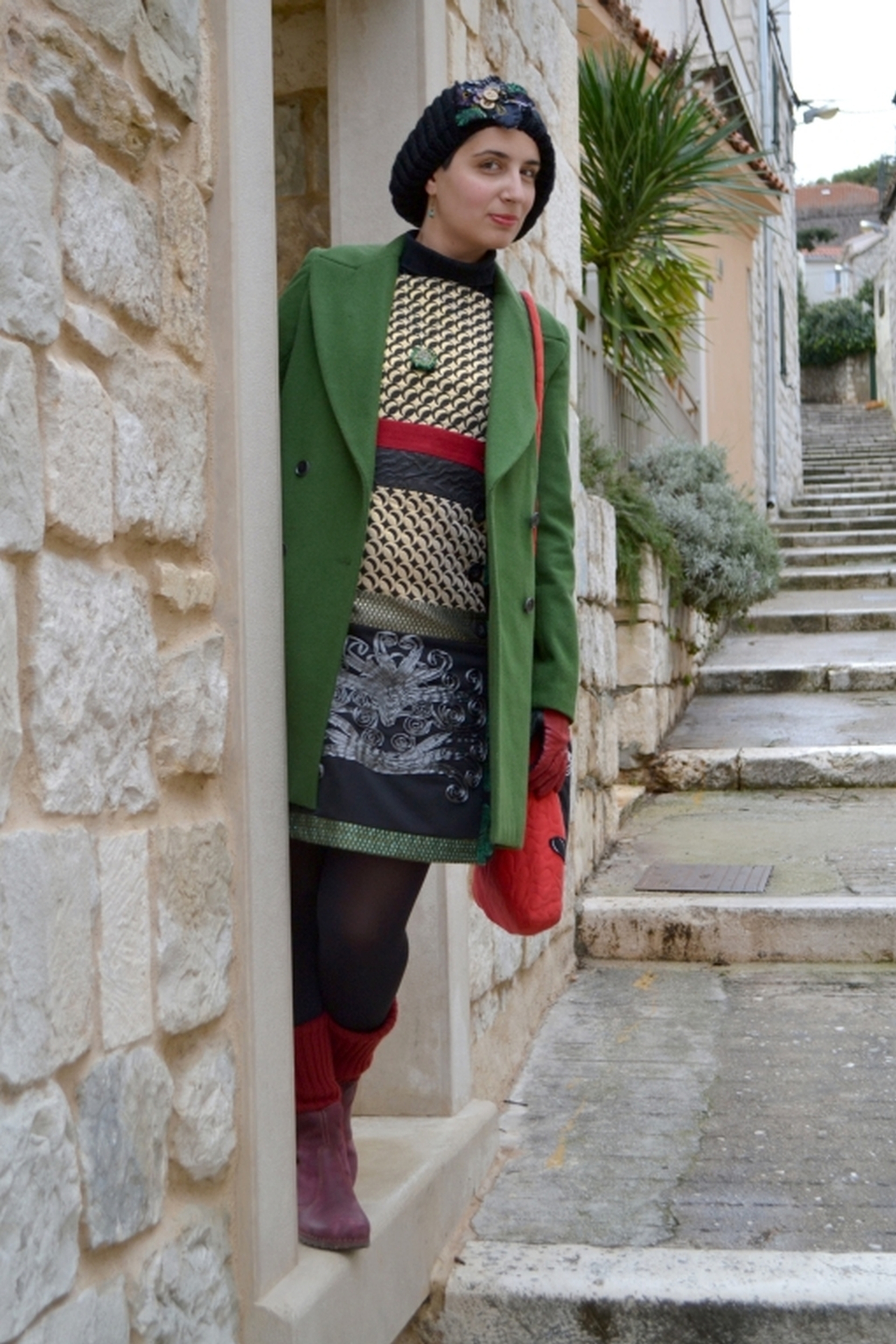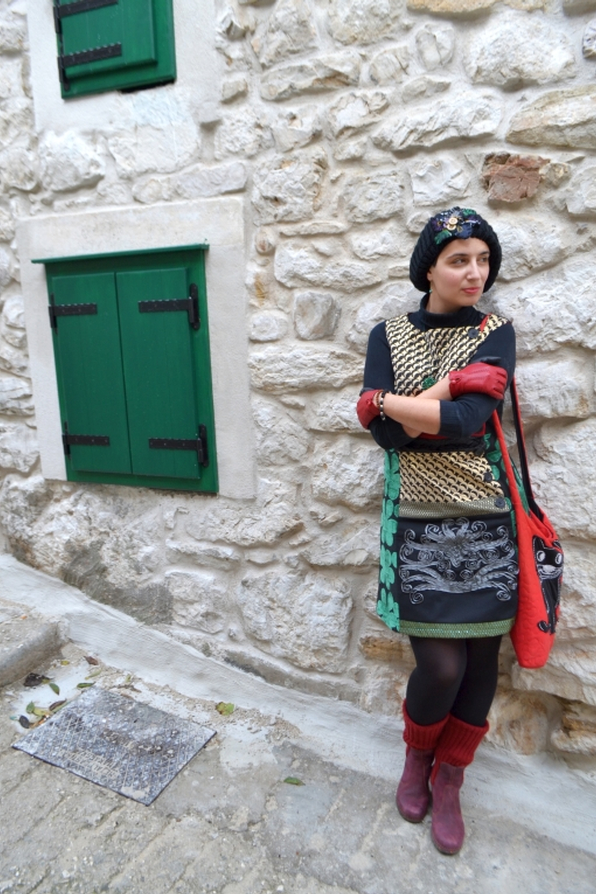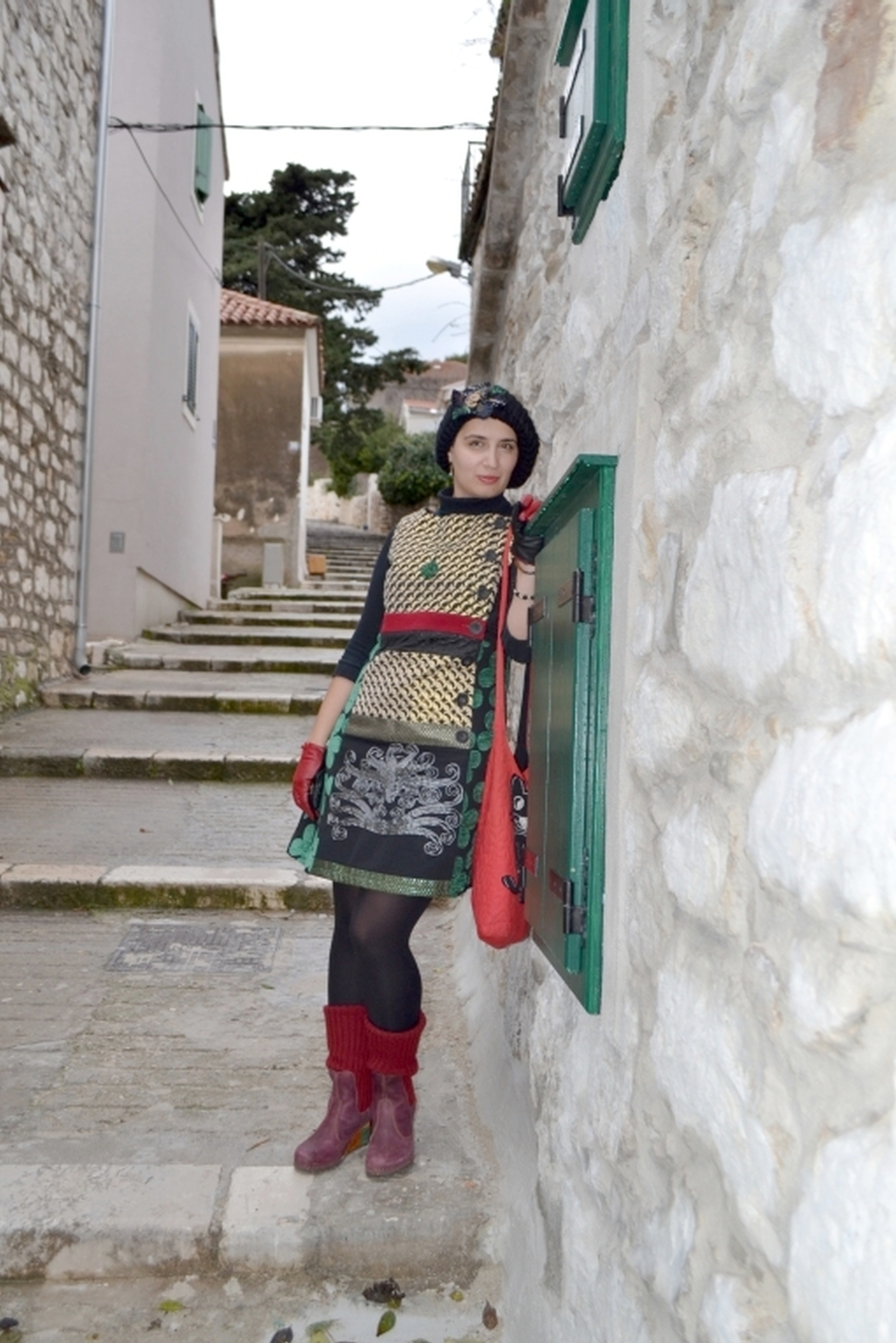 Wool cap by Desigual, bought on E-bay; Turquoise earrings by Kamena Duga, Croatia; Malachite necklace by Viletina Art and Design, Croatia