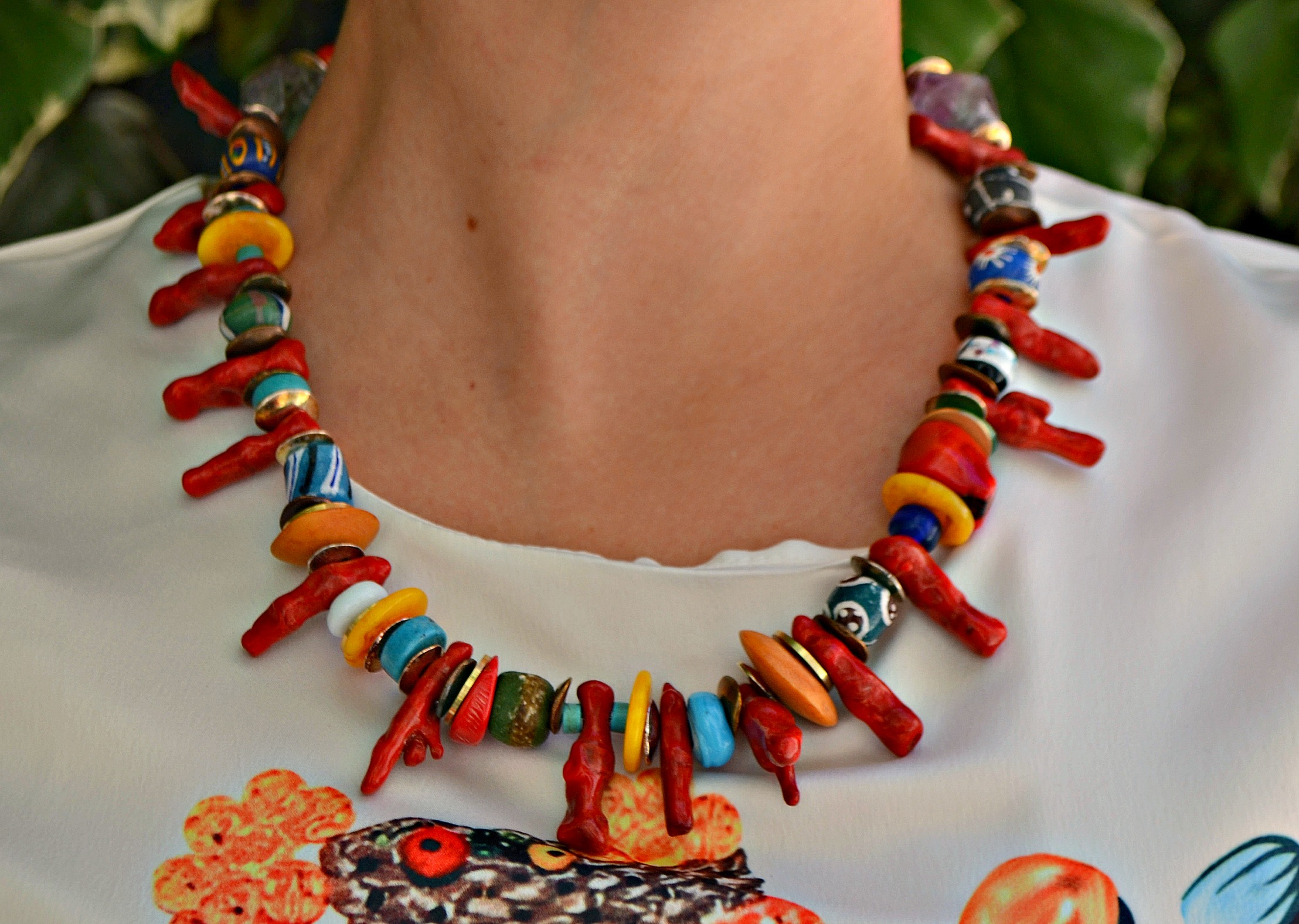 “Vibrant and casual, this unconventional necklace is for a Bohemian fun-loving soul. Organic branch coral from Indonesia provide a pulsating frame for complementing beads and pieces, in diverse shapes, materials and colors. Nepalese copal, camel bone from Mauritania, Greek copper, brass and pewter, semi-precious fluorite and turquoise. Yet the most exciting elements are the array of glass beads from different continents, and from various ages. Anatolian glass, recycled glass beads and Krobo powder glass from Ghana, ancient Venetian Trade beads, Indian crow beads, vintage translucent White Heart beads. The collection of these little treasurers originate from Africa, Europe and Asia, and each of them is just like a little token brought from journeys through place and time.“