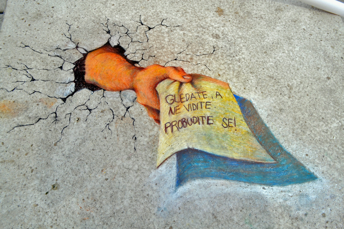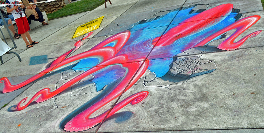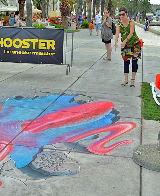 “SPLIT 3D Street Art Festival is a non-profit event where artists draw 3D images with chalk on the sidewalk. This peculiar way of drawing is known as the “one-point view” because the full visual impression is obtained only from a certain angle. It originated from the tradition of “Madonara”, artist of sacred images in Italy. Bard of the modern variants of artists is Kurt Wenner.