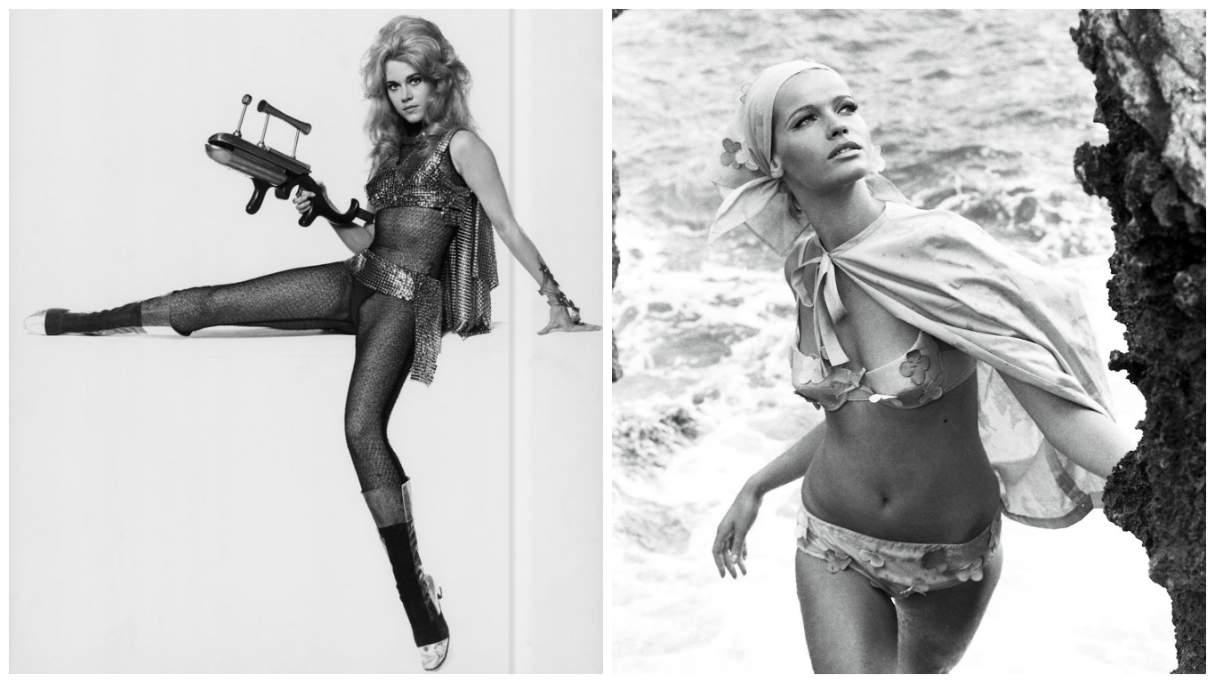 Futuristic, metallic cape worn by Jane Fonda in the cult classic Barbarella, from the 1960s. Also, note Veruschka, the famous model of the decade, wearing a light and breezy summer cape.