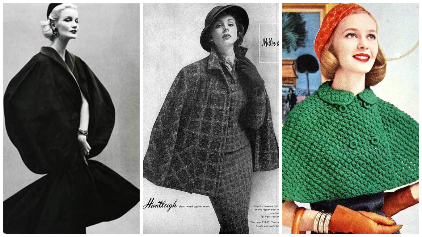The cape had another big moment in the 1950s, especially in France, as a part of the New Look. It was designed with simplified lines in minds and thus became a great showcase for tweedy, check and mohair fabrics – easy lines of a cloak were perfect to show the fabric to perfection.